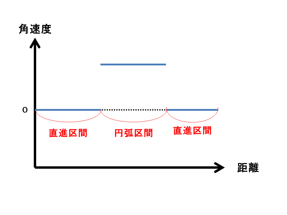 ここで角速度を考えてみましょう。この円弧だけのスラロームでは角速度は下図のように変化するはずです。