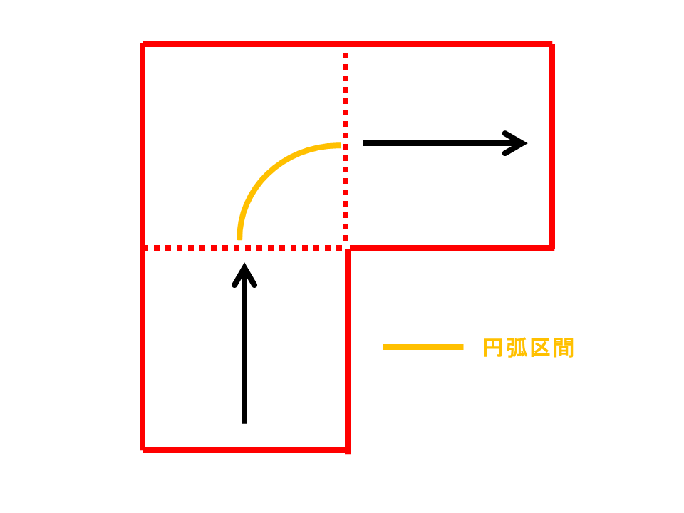 一見この図は円弧のみのときと軌跡は変わらないように見えますが、それは図が小さいからです。