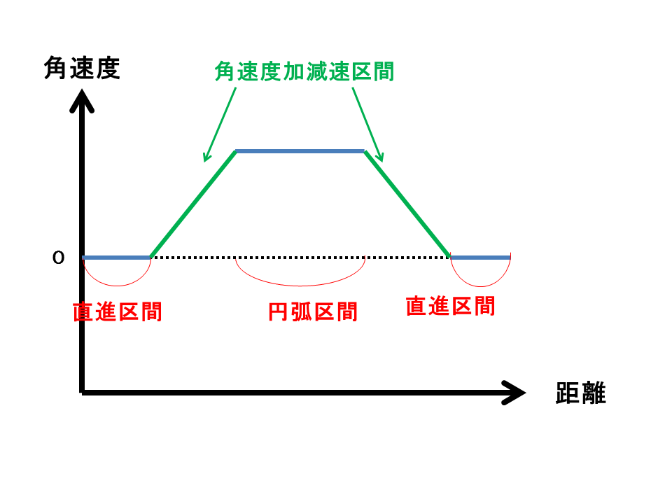 前述のようにスラロームとは直進と角速度の台形加速の組み合わせです。乱暴な言い方をするなら、直進時の台形加減速の速度でなく角速度バージョンです。