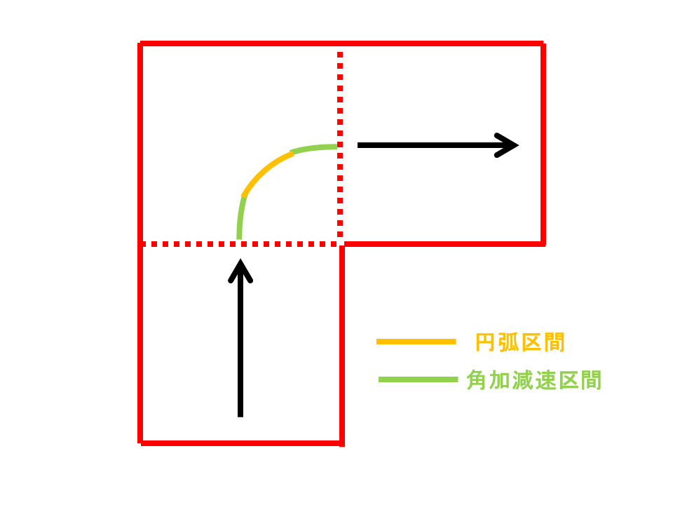 実際にスラロームを導入するとわかりますが、計算上の軌跡と実際のマウスの軌跡は一致しません。それにはスリップ角だとか難しい要因が関わってくるのですが、ここでは省略します。