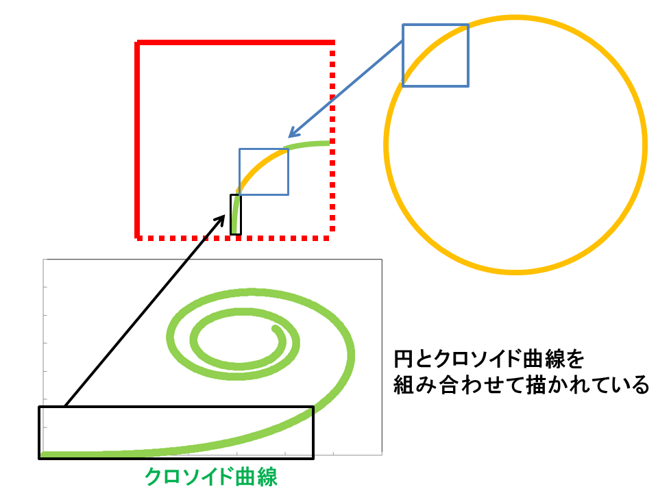 ちなみに、図中下部の緑の曲線はクロソイド曲線といいます。興味のある方は調べてみてください。