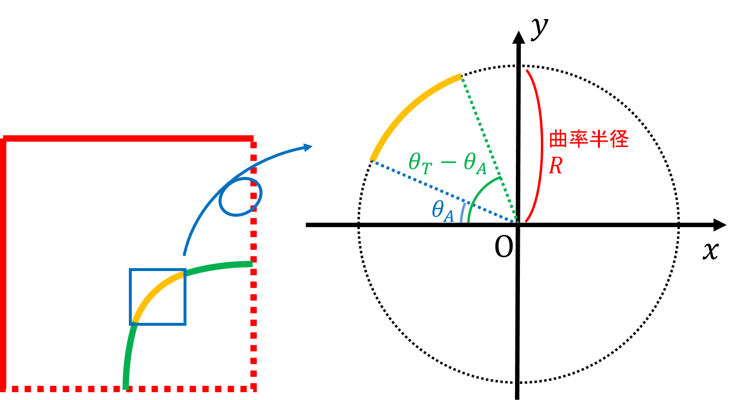 ここで、円弧の曲率半径をRと置きました。