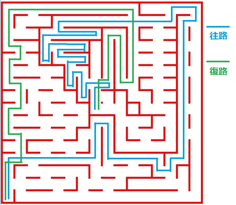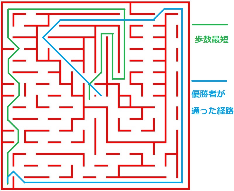 狙ってかわかりませんが、nocheさんは重ね探索せず迷路の左側を見なかったことで緑の経路を避けていました。